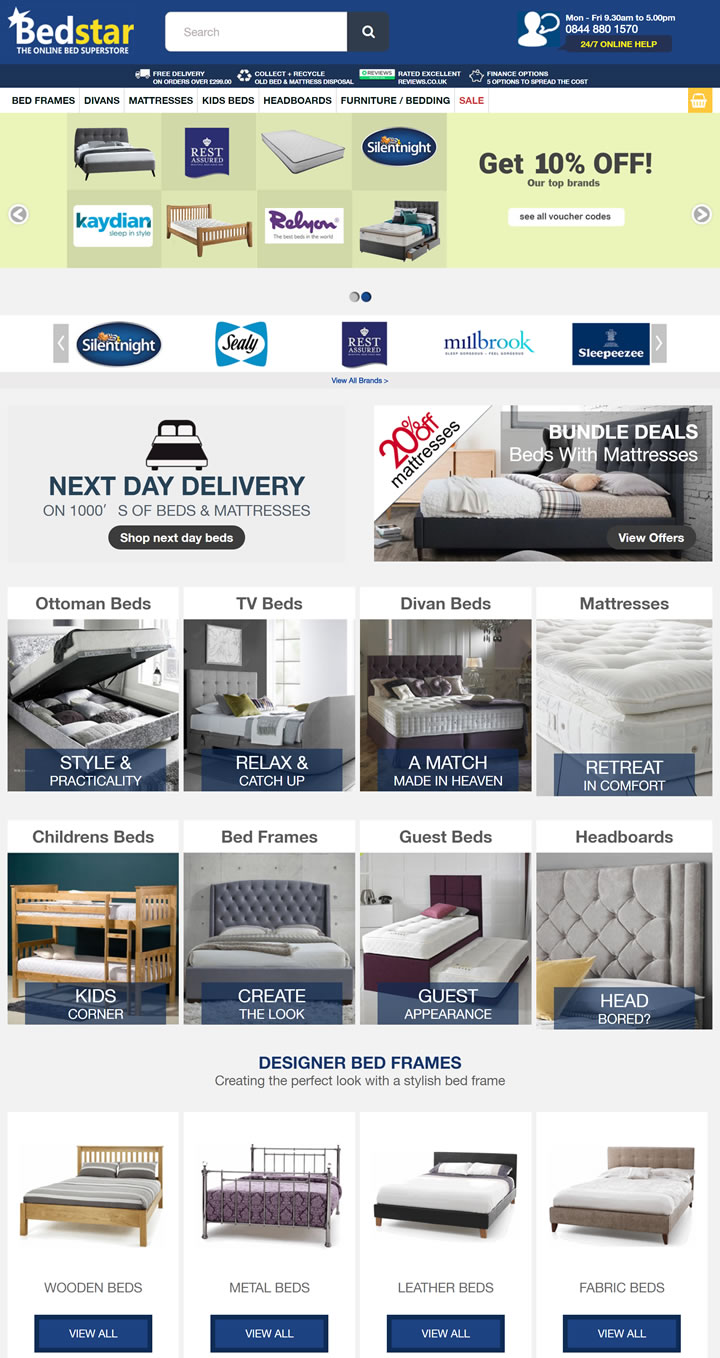 bedstar .co.uk是最大的在線床上超市之一,銷售頂級品牌床、床架、床墊和沙發床,訂單超過499英鎊免費英國送貨。我們的商品價格范圍從40英鎊到4000英鎊不等。我們的平均售價為400英鎊。我們目前有超過8000種產品待售。