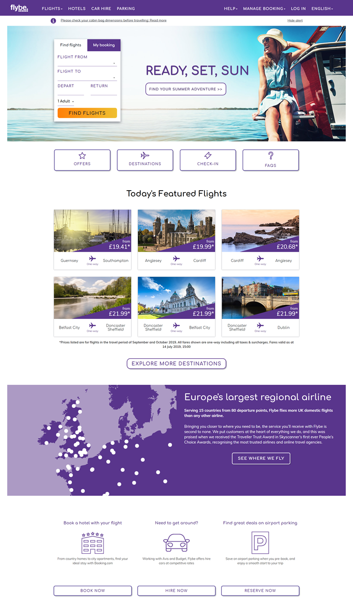 Flybe航空公司是歐洲最大的獨立支線廉價航空公司,總部設在英國德文郡埃克塞特(Exeter)。它有上百條航線,遍布全世界9個國家62個機場。在英國的主營城市有22個:Aberdeen、Bath、Belfast、Birmingham、Bristol、Cardiff、Doncaster、Dundee、East Midlands、Edinburgh、Exeter、Glasgow、Inverness、Islay、Isle of Man、Leeds、Liverpool、London、Manchester、Newcastle、Norwich和Southampton。