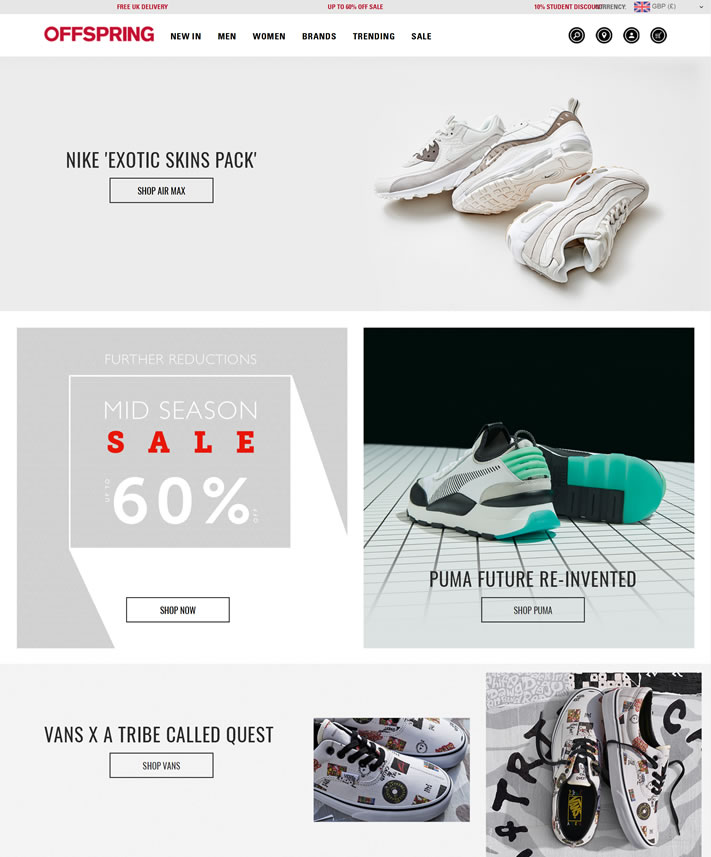 Offspring是英國老牌潮鞋店,主營各大品牌的經(jīng)典款以及限量發(fā)行款鞋品,有很多的線下門店,每當(dāng)新品發(fā)售總會(huì)有很多人排隊(duì)購買。追求時(shí)尚、尋求與眾不同的時(shí)尚達(dá)人絕不能錯(cuò)過,各種設(shè)計(jì)師品牌合作款、限量款都能在這里找到。常駐10%的學(xué)生折扣!
