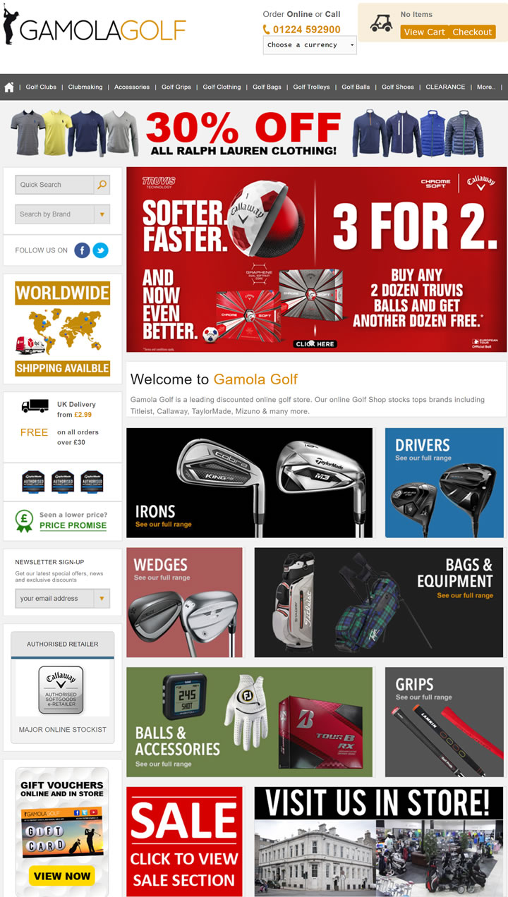 在我們打折的在線高爾夫商店,我們出售頂級品牌,包括Titleist、Callaway、TaylorMade、Mizuno等。Gamola Golf是英國領先的在線高爾夫商店。