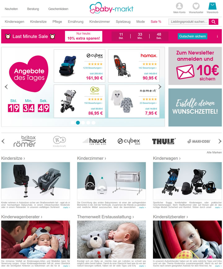 baby-markt是德國和奧地利領(lǐng)先的嬰兒和學(xué)步設(shè)備在線零售商之一。baby-markt有100000多種嬰幼兒需求的產(chǎn)品,以及來自Römer、Hauck、Bugaboo、Pampers Maxi-Cosi、Chicco、Brio、Disney、Haba、Steiff等領(lǐng)先品質(zhì)品牌的玩具。