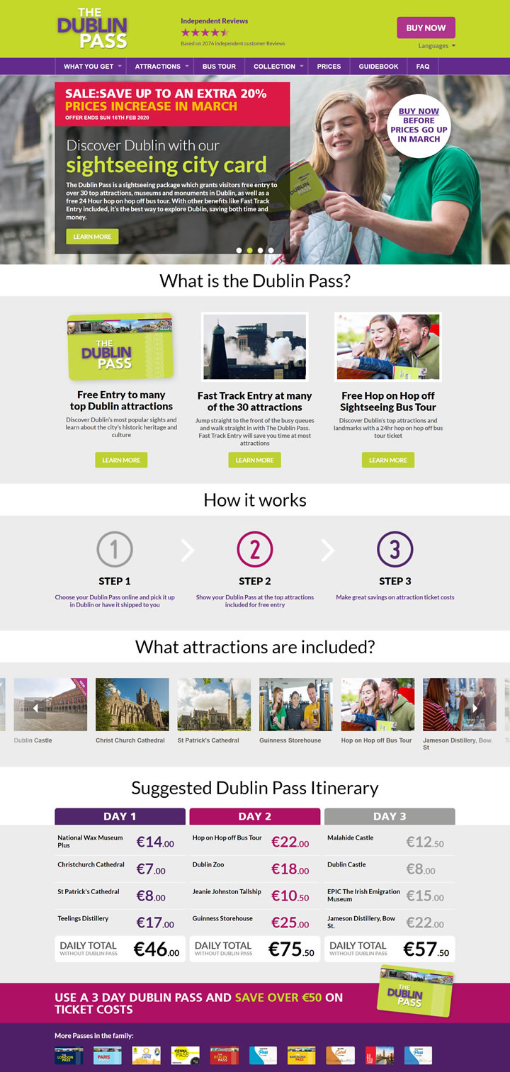 The Dublin Pass是一個(gè)觀光套餐,允許游客免費(fèi)進(jìn)入都柏林的30多個(gè)主要景點(diǎn)、博物館和古跡,以及免費(fèi)的24小時(shí)隨上隨下巴士之旅。除了包括快速通道入口在內(nèi)的其他好處,它是探索都柏林的最佳方式,節(jié)省時(shí)間和金錢。