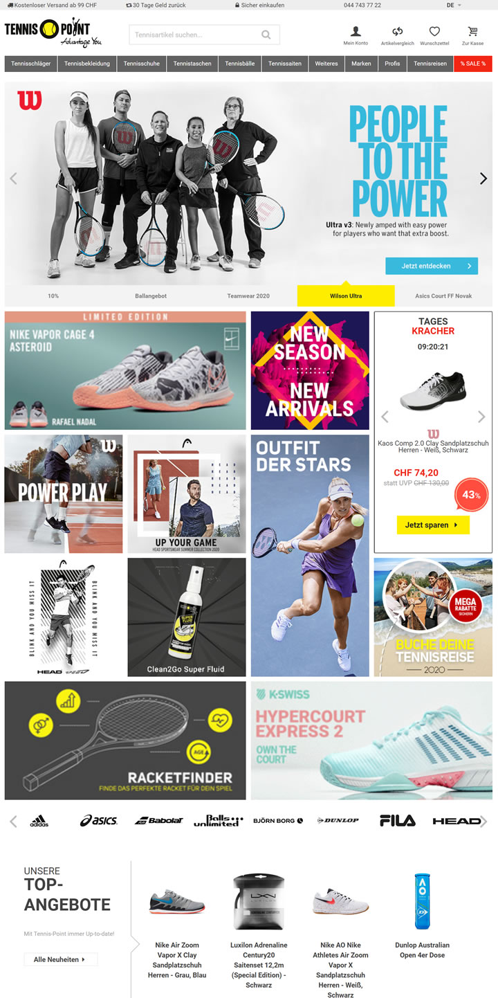 Tennis-Point不僅是一家網球商店,而且為所有網球迷帶來啟發。在將近二十年的時間里,我們一直在嘗試通過提供廣泛的網球產品來激發全世界的網球狂人們,提供最新的網球新聞以及出色且對客戶友好的購物體驗。我們的使命是改善客戶的游戲體驗,從而喚醒處于休眠狀態的客戶。我們設計了簡單、直觀的智能手機和平板電腦頁面,以便我們的客戶可以隨時隨地方便地購物。