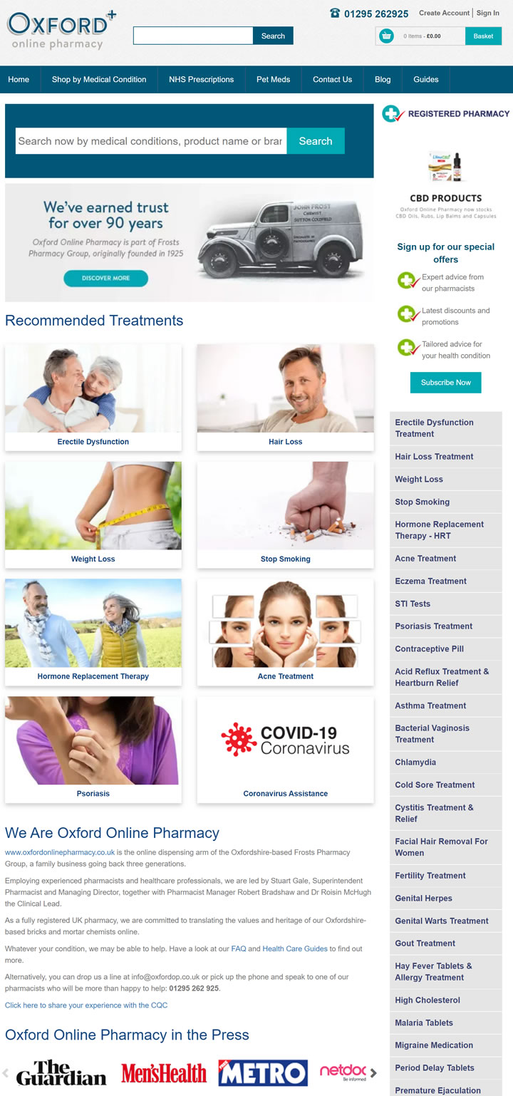 Oxford Online Pharmacy是位于英國的在線藥房和私人醫生咨詢服務。作為Frost Pharmacy Group的在線配藥部門,該集團還包括實體社區藥店。1925年由現任所有者和首席藥劑師Stuart Gale的祖父John Frost創立。
