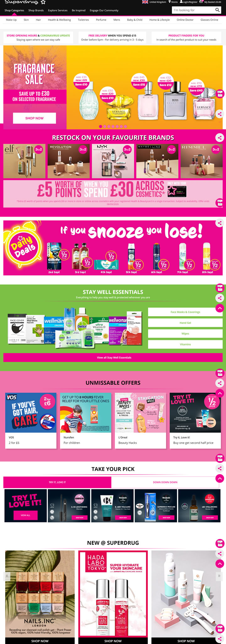 英國superdrug創辦于1966年,主營保健和美容,在英國擁有800多家實體門店藥房,目前superdrug已經被李嘉誠收購,號稱“英國屈臣氏”。Superdrug主要銷售護膚品、保健品和日用品。