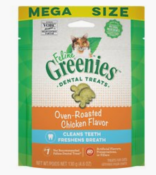 4、Greenies Feline Oven Roasted Chicken Flavor Adult Dental Cat Treats, 4.6-oz bag $4.48 $4.99