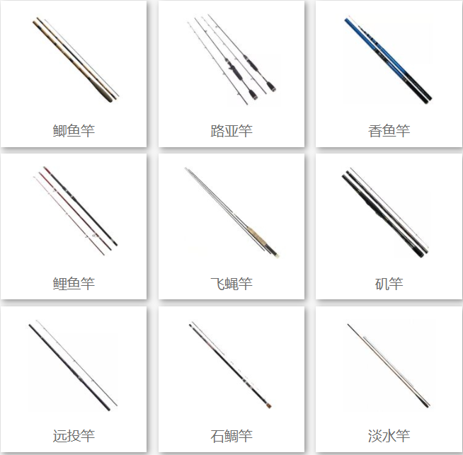 魚竿,大致可分為,鯽魚桿,路亞竿,香魚竿,溪流竿,鱒魚竿,鯉魚竿,飛蠅竿,磯竿,船竿,黑鯛竿,遠投竿,石鯛竿,淡水竿,海水竿,江戶川十二類(分類不完全詳盡),不同的水域、深度、適釣魚類,所選擇的魚竿都是不同的,這也是常見到專業的釣魚人往往有很多魚竿的原因。
