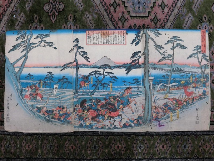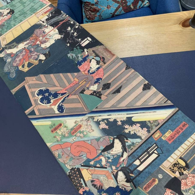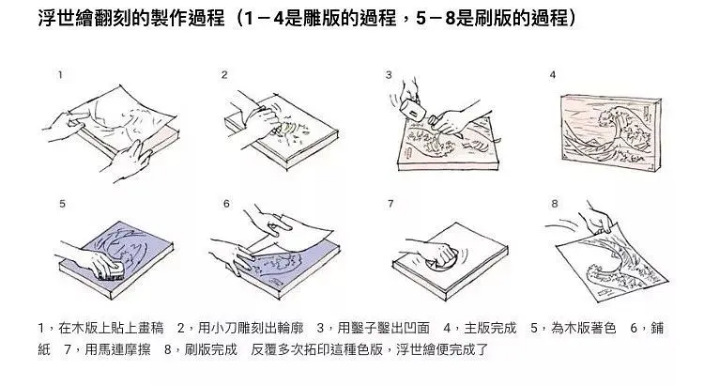 制作浮世繪共需三個人:一人作畫,一人刻版,另外一人把同一張紙,貼在不同的刻版上,譬如一版、二版、三版……然后用不硬不軟的、類似粽子葉包裹著的東西,在板子上刷色。