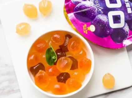 這個糖外面有一層薄膜包裹著,里面是軟軟的如葡萄果實一般的感覺,就像在吃真葡萄,不像一般的QQ橡皮水果軟糖,這個吃起來口感很特別。而且,冷藏食用味道更佳,冰冰涼涼,QQ軟軟的。