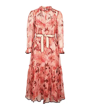 這款中長款采用褶皺真絲制成,飾有繪畫般的粉紅色花朵,塑造出寬松的廓形,采用高領、柔美的荷葉邊飾邊和收緊腰帶。