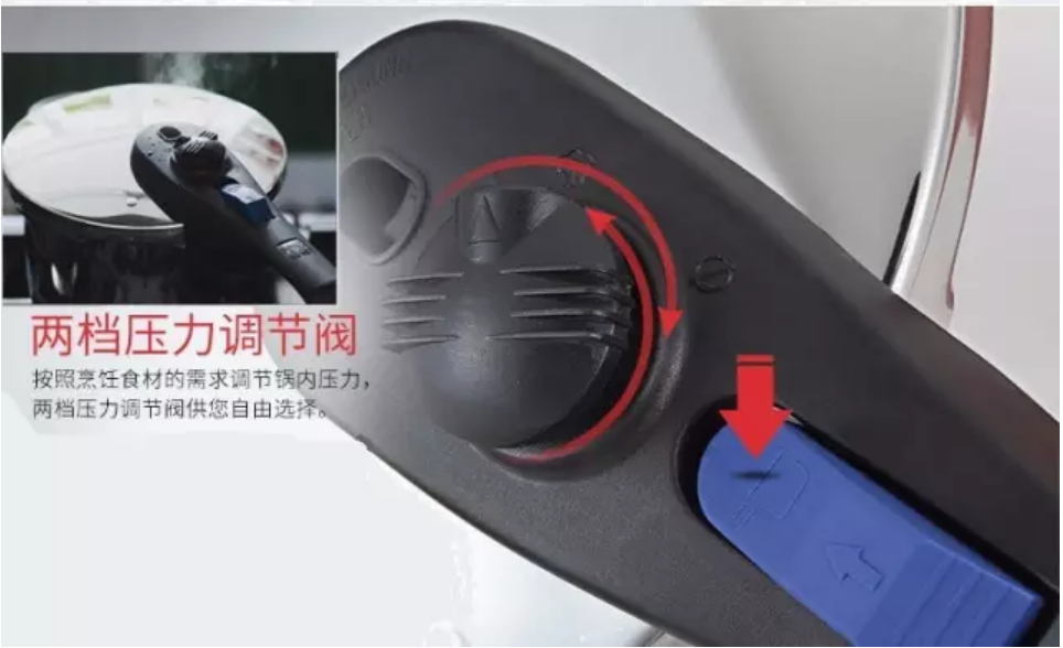 兩檔壓力調節閥,可調節鍋內壓力。壓力鍋蓋集多重保護于一體, 沒有任何危險性。