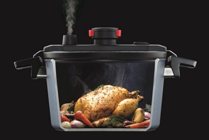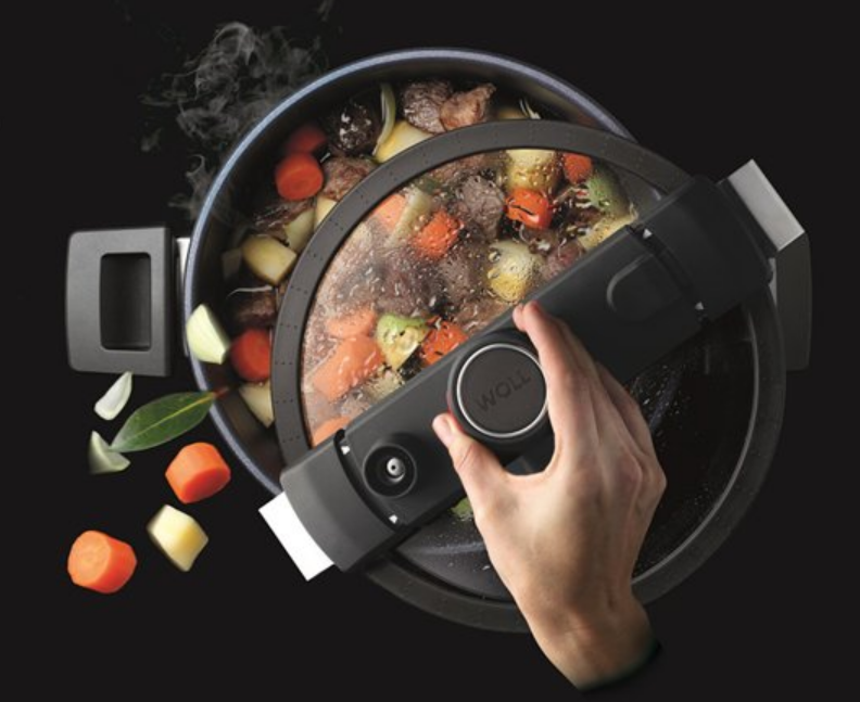 其中較為典型的代表就是德國廚具品牌WOLL新近推出的微壓鍋,這款鍋子德國制造,擁有的專利微壓鍋蓋,不僅有著智能安全閥來控制內部壓力,還有著強大密封功能的硅膠密封圈,同時壓力把手也能起到密閉的作用。所以在燉菜煲湯的時候,可以隨時打開蓋子查看燉菜的火候,可以隨時品嘗美食味道,甚至可以逐漸加入自己喜歡的配料,再不用擔心火候問題。
