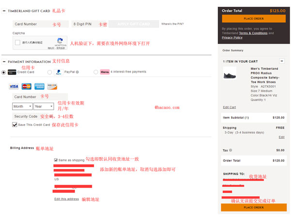6、接著進入填寫支付信息以及賬單地址頁面,確認無誤點擊PLACE ORDER提交完成訂單。