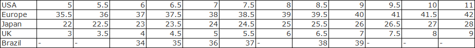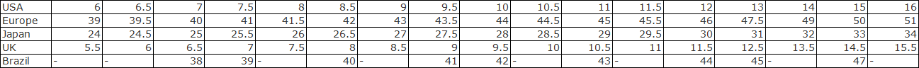Timberland 男鞋尺碼對照表: