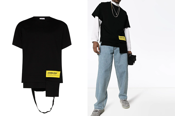 Ambush這件黑Tee造型非常獨特,采用分層拼接的形式,估計潮男們要把持不住了喔??拷聰[處的醒目黃色標簽是滿滿的潮牌味道,各位男娃們可以像模特小哥哥這樣搭配銀色配飾,能讓胸前大面積的黑色空白處顯得更加豐富,帥氣加倍哦!