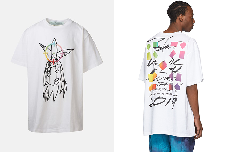 Off-White經(jīng)典的黑白十字箭頭標志突然變成了彩色的,真的差點沒認出來!這件印花Tee可以說是“360度無死角”:正面的外星人印花獨特中透露著可愛,抽象但不失美感;背面則采用由彩虹色塊組成的十字箭頭和隨性的手繪文字,真·潮!不過,委員要提醒大家,這件版型偏大,所以大家在選碼的時候要注意一下。