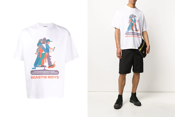 這件白Tee來自Opening Ceremony和紐約嘻哈樂隊Beastie Boys以及藝術家Geoff McFetridge推出的三方聯(lián)名系列,配色和圖案都很出彩。T恤正面的三個小人兒正是樂隊的三位成員,低飽和度色調的巧妙運用,讓它看上去是不是很像Lifestyle雜志里面的治愈插圖?時尚界和藝術界的“牽手”總是能給我們帶來不一樣的驚喜!