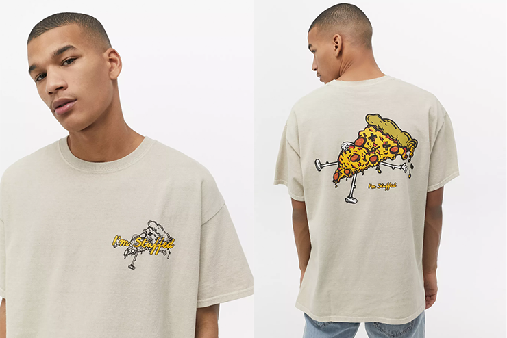 UO家大部分的衣服還是以潮流運動風為主。委員推薦的這款T恤是一種蠻小眾的米色,擬人化的披薩圖案,“I’m Stuffed”的趣味Slogan,是讓人看了會會心一笑的俏皮設計。和正面相對內斂的小圖案相比,背面大面積的印花設計才是最大亮點!