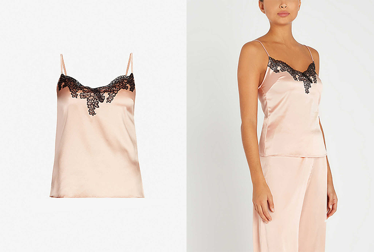 對于比較保守或者家里有室友的寶寶,如果覺得上面的小睡裙過于性感,也可以考慮分體式的睡衣。Agent Provocateur這套絲綢的睡衣分上衣和褲子,既可以買來單穿也可以成套配在一起(鏈接是它的上衣部分)。絲綢的小吊帶透氣、柔軟、親膚,領口部分的蕾絲花邊讓簡單的小吊帶又多了一絲性感和神秘,外面套上同款絲綢外套,嘖嘖,頗有最近大熱韓劇《夫妻的世界》中女主那種御女范兒呢!