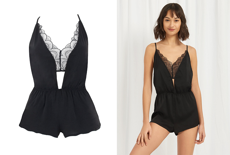 除了睡裙、分體睡衣,還有一種連體褲睡衣很受歡迎。這種睡衣既有睡裙的性感,又可以很隨意地活動。這款連體褲睡衣的設計有點俏皮性感風格,前胸點綴鏤空蕾絲,下身又是稍顯帥氣和利落的短褲。可以說把性感和帥氣結合得剛剛好,這種性感真的好高級!