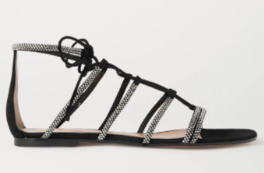 Gianvito Rossi 這款涼鞋定能在你的行李箱中贏得一席之地。單品采用柔軟的絨面革制成,點(diǎn)綴鞋面的數(shù)排水晶可在陽光下閃耀出動(dòng)人光芒,亦能在舞池里與燈光交相輝映。綁帶式袢帶繁復(fù)精致,巧妙添加優(yōu)雅之感。