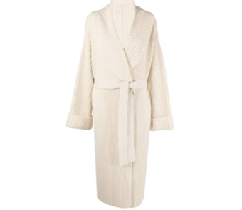 There Was One羅紋針織束腰開襟外套,象牙白色、初剪羊毛羊絨混紡、粗羅紋針織、披肩領、長袖、卷邊、兩個側置插袋、長款。