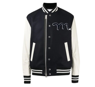 sacai標語印花飛行員夾克設計亮點海軍藍色、米白色、羊毛、拼接設計、圓領、正面飾有拉鏈、長袖、彈性松緊邊。