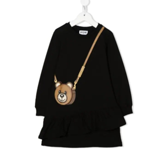 Moschino Kids泰迪熊印花衛衣式連衣裙,黑色、棉、平紋針織抓絨、標志性泰迪熊圖案、荷葉邊、圓領、長袖、平直下擺。