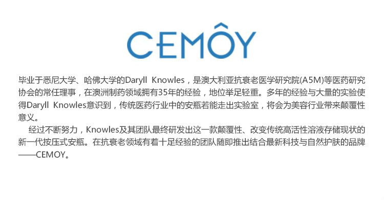 Cemoy 澳洲安瓶是一款無菌真空,不含防腐劑的高濃縮精華。科技型高濃度配比,天然活性成分高達95%,讓肌膚快速吸收養分,持久水潤。