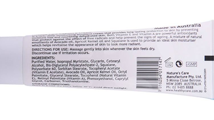 Healthy Care維E保濕滋潤面霜采用純天然配方,不含人造色素或香料,富含天然維他命E、牛油果油、杏核油以及維他命A,能夠保濕和滋潤肌膚。