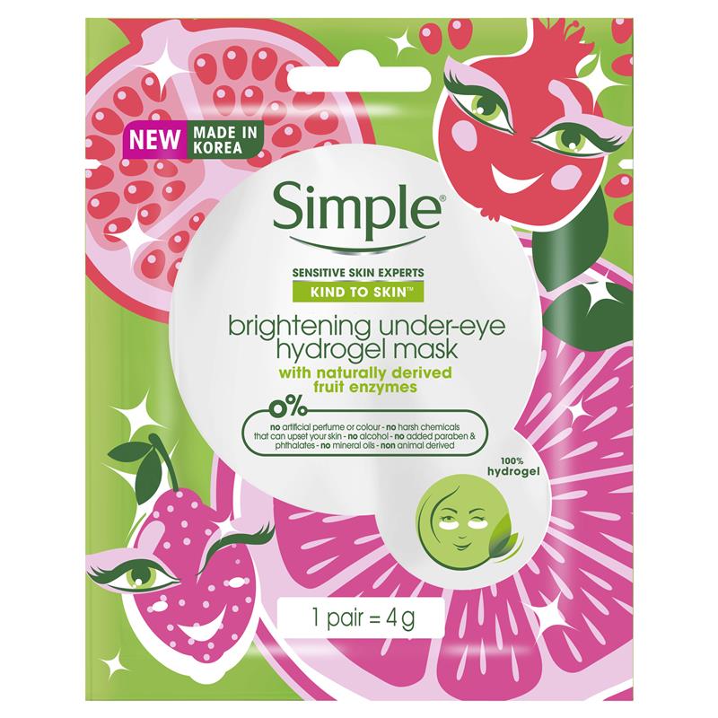 Simple 眼部亮膚水凝膠面膜,100%水凝膠成分,鎖水保濕,淡化眼部黑眼圈和細紋,肌膚瞬間亮白。含有天然的水果酶,為肌膚補充營養。凝膠質地,完美貼合眼部輪廓。經皮膚測試,低過敏性。