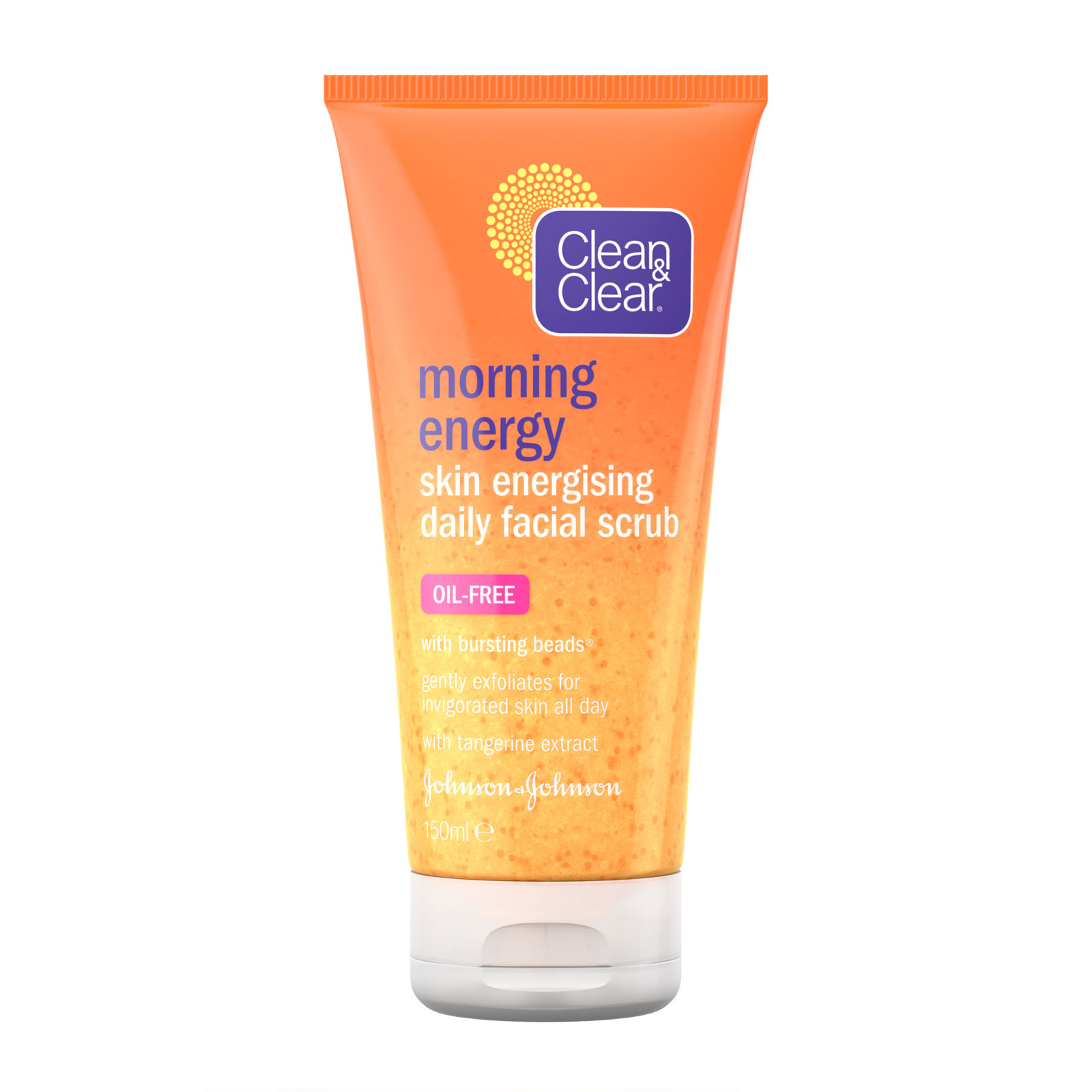 Clean & Clear Morning Energy Skin Energising Scrub The Clean & ClearMorning Energy Skin Energising Daily Facial Scrub, with bursting beadsand vitamin C & ginseng, leaves your skin feeling clean, refreshed and invigorated. Plus it has a refreshing citrus fragrance that awakens your senses! Wet your face and squeeze the scrub into your palm.