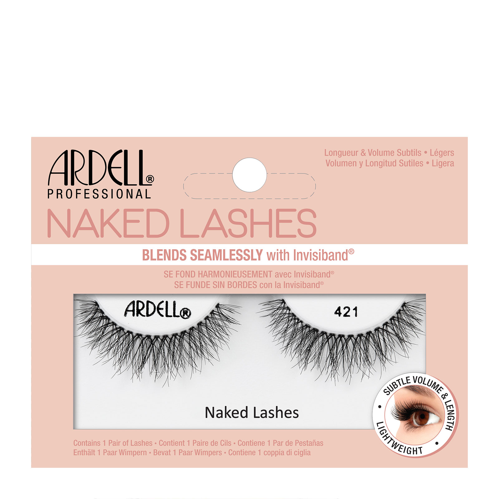 Nail the no makeup look with the Ardell Naked Lashes 421. A lash style which is fuller in the middle to accentuate your pupils. This set is perfect for falsie lovers who adore natural looking lashes thanks to the mid length and volume with crisscross layering.