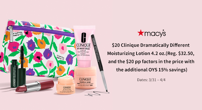 美國Macy's官網開啟clinique倩碧專場,滿贈好禮,滿$33贈7件套,價值高達$105,梅西百貨經常會有許多折扣力度很大的優惠促銷活動,海淘購買十分劃算。