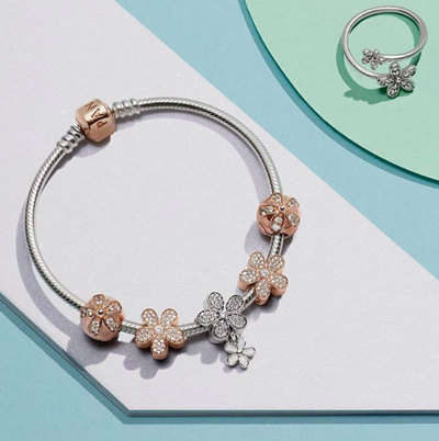 手鐲搭配:Dazzling Daisy Charm £75.00、Dazzling Daisy Duo Pendant Charm £ 70.00、Dazzling Daisies Clip £55.00、Moments Silver Bracelet With Pandora Rose Clasp £65.00