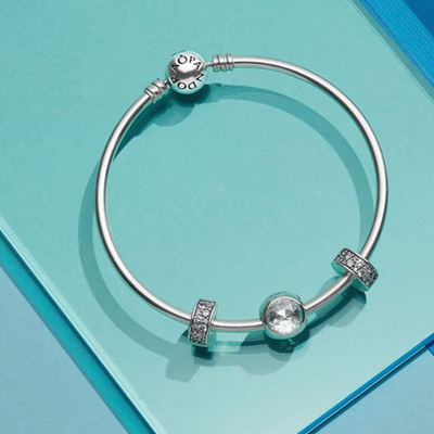 手鐲搭配:Shining Elegance Spacer Clip、Radiant Droplet Charm、Moments Sterling Silver Charm Bangle