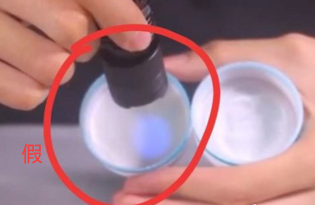 1、由于珂潤面霜內(nèi)包裝(包裝瓶)采用環(huán)保塑料材質(zhì),外包裝是紙質(zhì)盒子,并且用塑料膜塑封,因此用熒光筆照射時,并沒有反應;假貨一般采用玻璃瓶材質(zhì),照射時有明顯的反應,具體如圖所示: