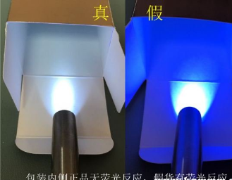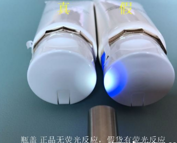 2、用紫外燈檢測,正品盒子內(nèi)測沒有熒光反應(yīng),里面的CPB洗面奶蓋子用紫外燈照射也沒有,假貨無論是盒子還是,洗面奶蓋子都有熒光反應(yīng)。
