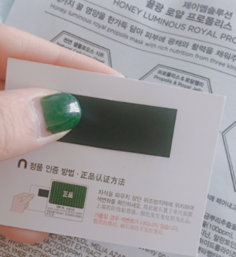 1、取出一片面膜,查看其外包裝背面右上角處。仙女就會看出一個小黑方框。其中會有防偽貼以及使用說明。其中防偽貼正中會有白色字體“正品”。