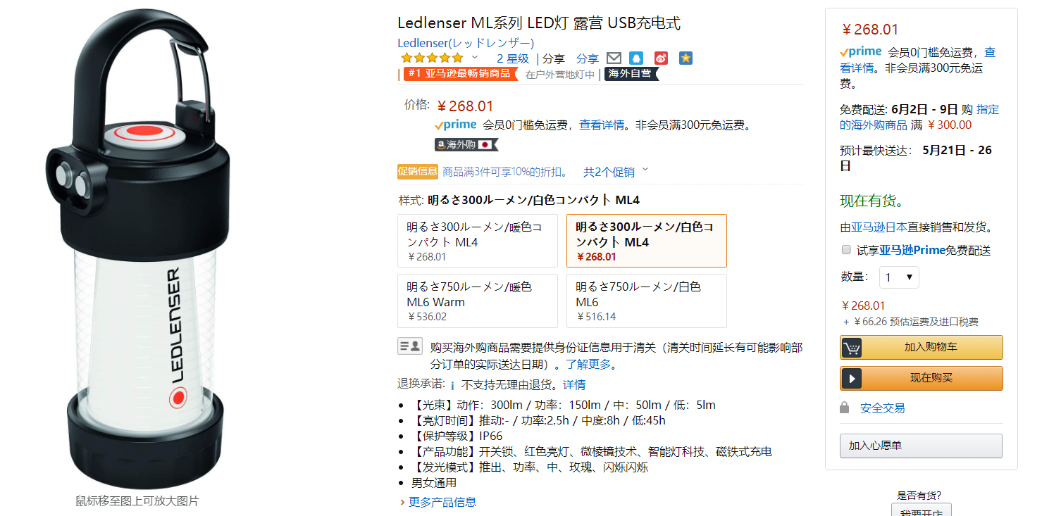目前海外購這款售價¥268.53,白色為此價,暖色差價不大,現(xiàn)在下單享受9折優(yōu)惠,3件需稅費¥73.32,prime會員無門檻免郵,到手約266.12/件,需要可入;