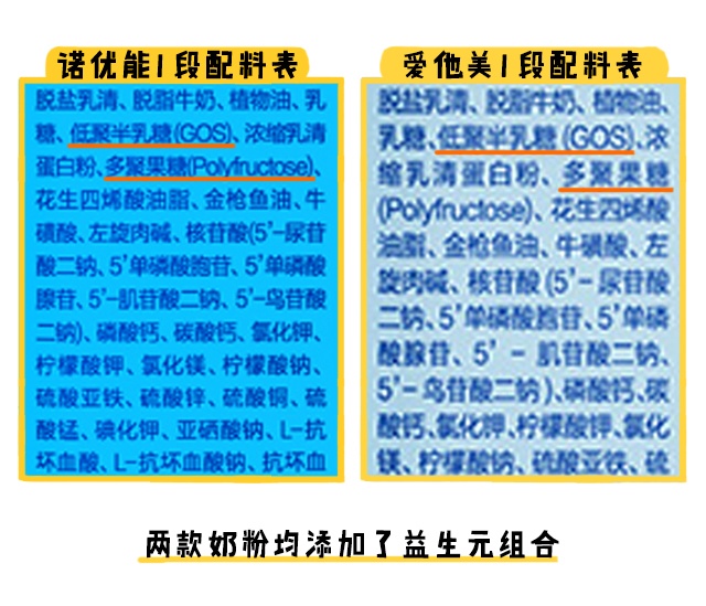 而普通奶粉一般都不會出現這種情況,少則會添加1-2個,以國行諾優能和愛他美為例。