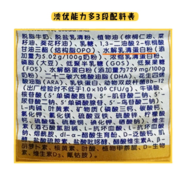 不過提醒一下大家,能力多不是水解奶粉。我們常說的水解奶粉是半特殊配方奶粉,奶基里面并沒有“奶”,水解奶粉的奶基全都是經過水解的蛋白質,用于預防蛋白質過敏,或緩解輕微蛋白質過敏癥狀。