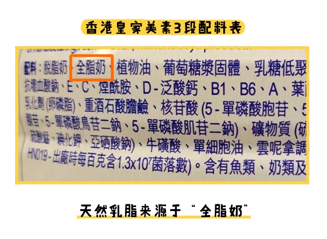 說完常規強化配方,接著我說說特色強化配方,這里說的特色強化配方指就是一些國標既沒有硬性規定要添加,而市面上也比較少奶粉會添加的營養成分。香港皇家美素3個段數都添加了天然乳脂。