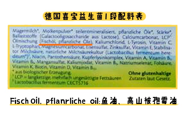 另外,這里說明一下DHA含量的問題,德國一般不會在奶粉中直接添加DHA,他們會通過添加其他成分讓寶寶在體內轉化成DHA,這款奶粉添加了魚油,高山被孢霉油來讓寶寶自身獲取DHA,所以配方表沒有標注DHA的具體含量。