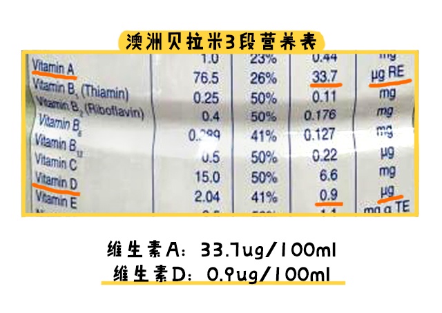 貝拉米3段的維生素A和維生素D含量均低于國標的最低標準。其中維生素A含量是33.7ug/100ml,換算成千焦為單位是11.31ug/100kj ,國標最低標準是18ug/100kj,維生素D含量是0.9ug/100ml,換算后是0.18ug/100kj,而國標最低標準是 0.25ug/100kj。