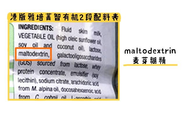 我查看了港版雅培菁智有機各個段數的配料表,它2段和3段都含有麥芽糊精,麥芽糊精是個十分好吸收的碳水化合物,不過它的弊端就是營養價值不高,由于成本較低,所以很多廠商都會添加麥芽糊精來降低營養價值更高的乳糖在碳水化合物中的占比,從而降低成本。