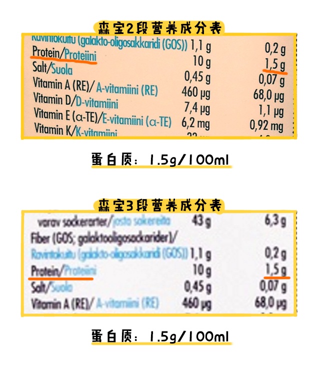 中國國標規定2段以上的奶粉,蛋白質添加量最少要達到0.7g/100kj,但按照營養成分表的信息來看,森寶2段和3段的蛋白質含量都是1.5g/ml,換算成千焦則是0.51g/100kj ,達不到國標要求。所以如果要選擇森寶2、3段的話,輔食方面要配合一下,適當給寶寶增加些蛋白質食物,讓寶寶能獲取足夠的蛋白質。