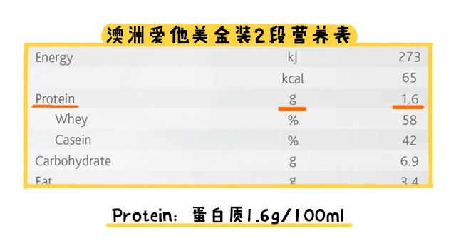 中國國標規定2段奶粉的蛋白質含量要達到 0.7-1.2g/100kj這個范圍,而這款奶粉2段的蛋白質含量只有1.6g/100ml,換算成千焦為單位是0.67g/100kj ,比國標的要求稍微低些。所以如果寶寶吃澳洲愛他美2段,寶媽們注意要在輔食方面配合一下,適當增加些蛋白質食物,例如豬肉、雞蛋、海帶、玉米等等。