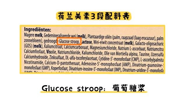 荷蘭美素去到3段就再?zèng)]有添加麥芽糊精了,不過(guò)卻加入了葡萄糖漿,葡萄糖漿的作用其實(shí)和麥芽糊精十分接近。