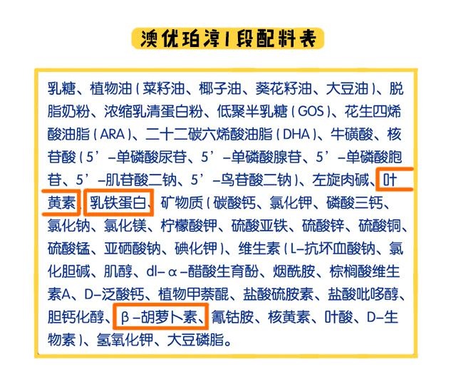 以上就是珀淳常規(guī)強(qiáng)化配方的添加情況,接著我繼續(xù)說特色強(qiáng)化配方。所謂“特色”,顧名思義,就是指市面上比較少奶粉會添加的營養(yǎng)配方。從配料來看,珀淳3個(gè)段數(shù)添加了葉黃素、β-胡蘿卜素和乳鐵蛋白3個(gè)特色強(qiáng)化配方。